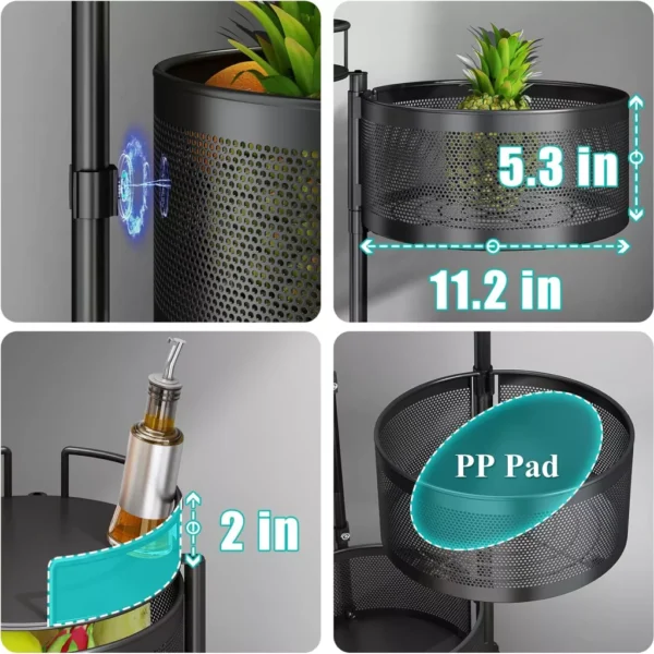 - 360° Rotating Storage Rack: Effortlessly access your stored items from any direction, thanks to the 360° swivel wheels and 270° rotating baskets.