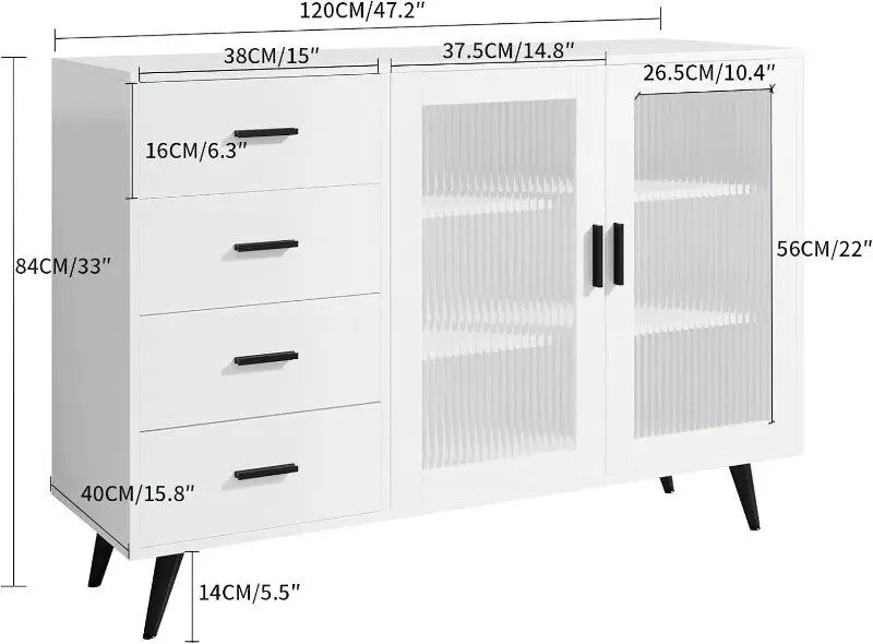 Introducing the perfect blend of elegance and functionality – our Sideboard Buffet Cabinet. This piece is a must-have for any modern home, beautifully designed to elevate your living space with its sleek white color and sophisticated black accents. Its unique combination of style and practicality makes it an ideal choice for various indoor settings.